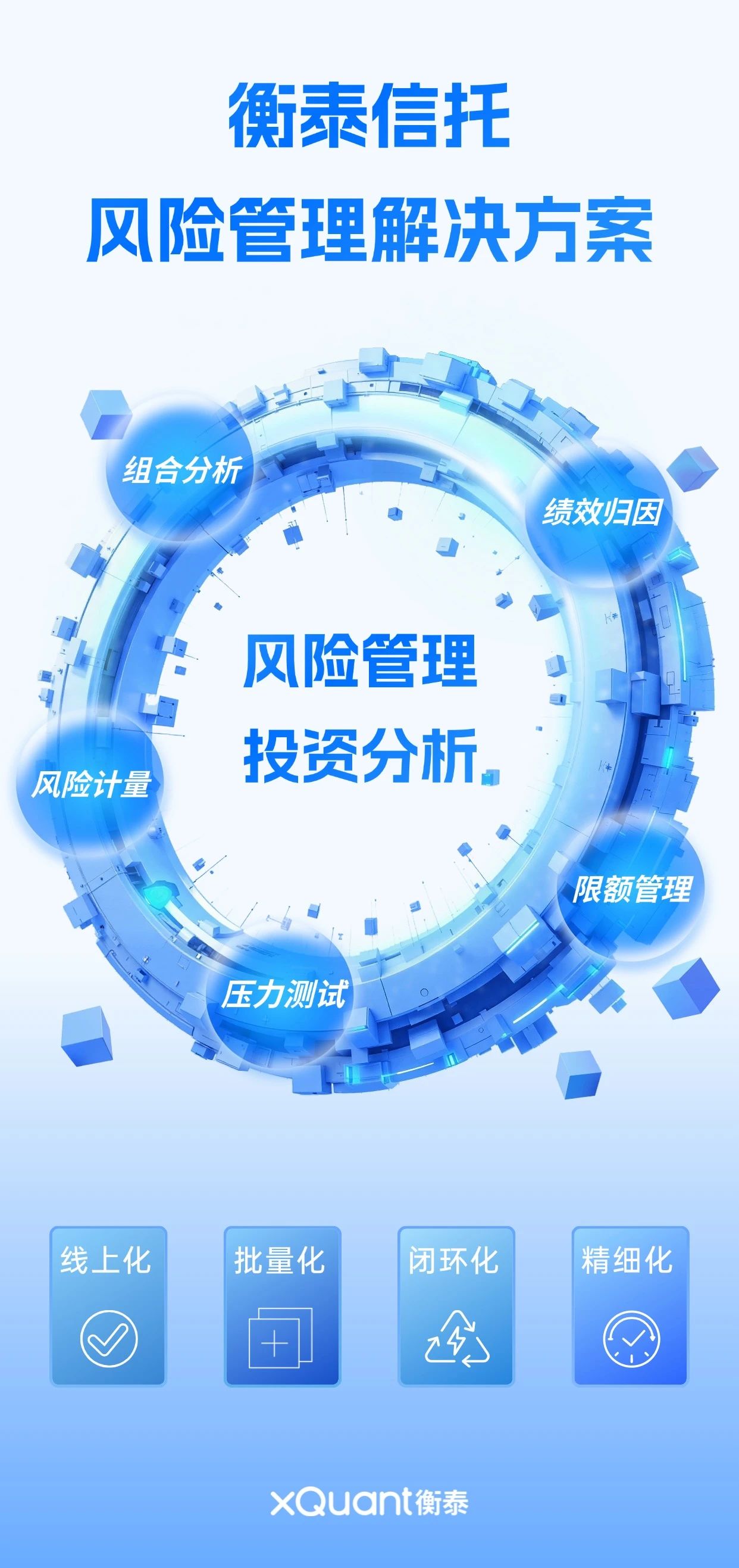 衡泰信托風險管理解決方案,憑借專業的定量分析能力以及領先的風險計量模型,融合信托業務場景,構建全面的風險管理矩陣,通過數據互通、風險計量、限額管理、歸因分析四大專業能力,打造精準風險識別、科學風險計量、高效風險處置、全流程線上化管控及前中后臺無縫協同于一體的統一風控管理平臺。