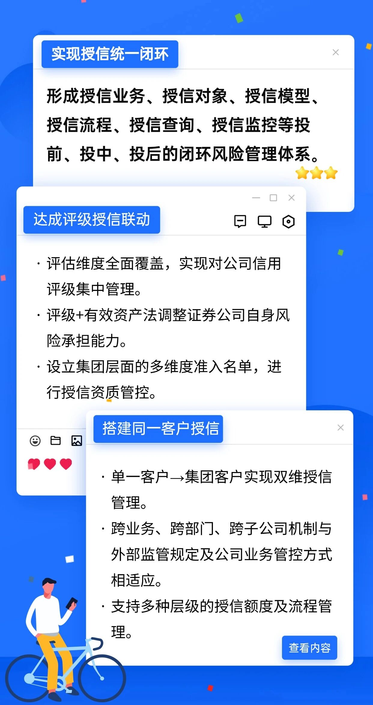 作為北方地區金融標桿,該券商上線同一客戶授信管理系統,實現同一客戶識別、統一評級、統一額度分配、授信監測和預警,全面滿足公司風險管理要求,顯著提升管理效率,為業務高質量穩健發展注入新動能。
